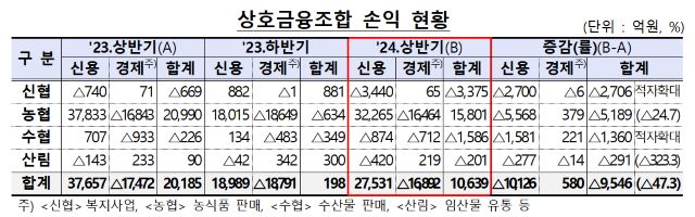 상호금융조합의 6월말 순이익은 1조 639억원으로 전년 동기 대비 9546억원(47.3%) 감소했다. 신용사업부문(금융) 순이익은 2조 75331억원으로 나타났다. 대손비용 증가 등으로 전년 동기 대비 1조 126억원 감소했다. 경제사업부문은 농·수산 판매수익 증가 등으로 적자 규모가 소폭 축소됐다.