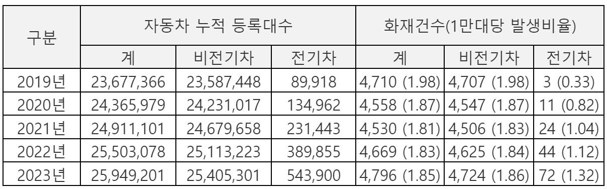 연도별 자동차 누적 등록대수를 기준으로 산출한 1만대당 화재 건수는 지난해 기준 비전기차는 1.86건, 전기차는 1.32건이다. 특히 전기차 화재 발생 비율은 비전기차에 비해 30% 정도 낮은 상황이라 전기차가 더 화재가 많이 일어난다는 것은 사실과 다르다는 지적이다.