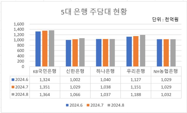 2일 은행별로 취합한 자료에 따르면 지난달 31일 기준 5대 시중은행(KB국민·신한·하나·우리·NH농협)의 주택관련 대출 잔액은 총 568조 6616억원으로 전월 대비 약 8조 9000억원 증가했다. 7월 이후 두 달 연속 역대 최고 증가폭을 기록했다.