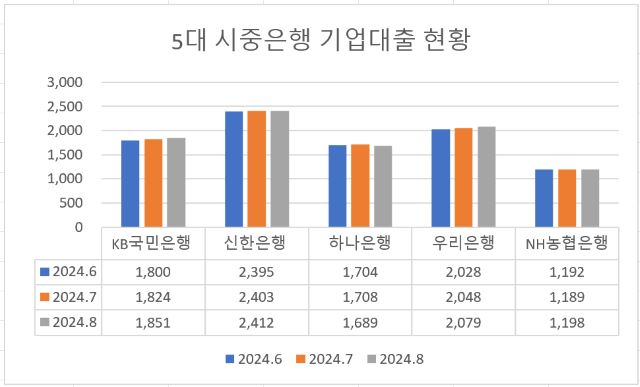 이처럼 가계대출을 확대할 길이 막히자 은행권은 기업대출을 경쟁적으로 강화했다. 5대 시중은행의 기업대출은 지난 6월 912조원에서 7월 912조 2000억원, 8월 922조 9000억원으로 증가세를 이어가고 있다.