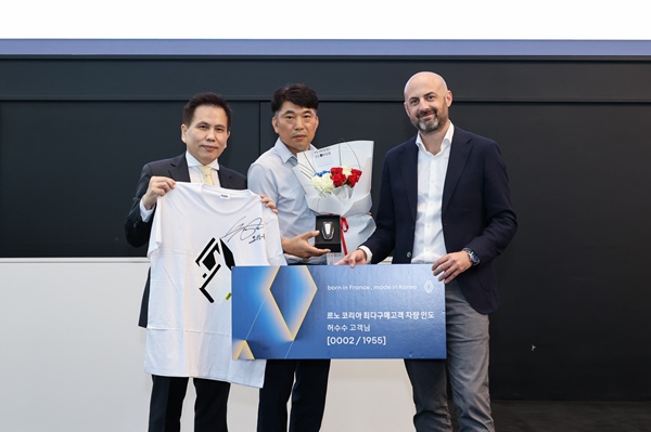 NSP통신-(좌측부터) 엠마누엘 알나와킬 르노코리아 영업마케팅본부장, 허수수 고객, 황재섭 르노코리아 영업 및 네트워크 총괄 전무 (사진 = 르노코리아자동차)