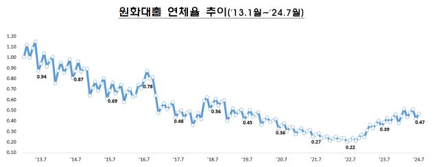 이와 함께 금융감독원에 따르면 지난 7월말 은행에서 1개월 이상 원리금이 연체된 대출이 0.47%로 전월 대비 0.05%p 상승했다. 지난 5월 0.58%에서 6월 0.46%로 하락한 뒤 한달 만에 상승 전환한 것.