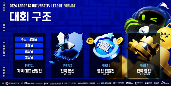 2024 이스포츠 대학리그는 대학생들과 이스포츠 문화를 함께 만든다는 의미를 담아 ‘PLAY, EXPERIENCE, TOGETHER’를 모토로 삼고, 리그 오브 레전드와 FC온라인 2개 종목으로 진행된다.