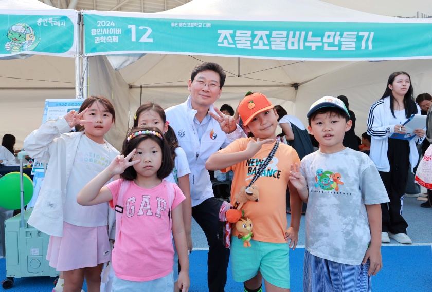 이상일 용인특례시장이 28일 제24회용인사이버과학축제를 찾은 어린이들과 기념촬영을 하고 있다. (사진 = 용인특례시)