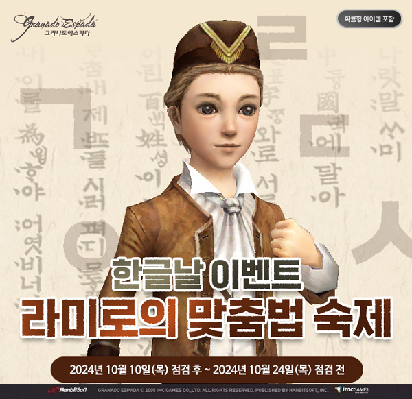 (서울=NSP통신) 이복현 기자 = 한빛소프트가 PC 온라인 MMORPG 그라나도 에스파다(개발 IMC게임즈)에 한글의 소중함을 되새기는 ‘라미로의 맞춤법’ 이벤트를 진행한다.