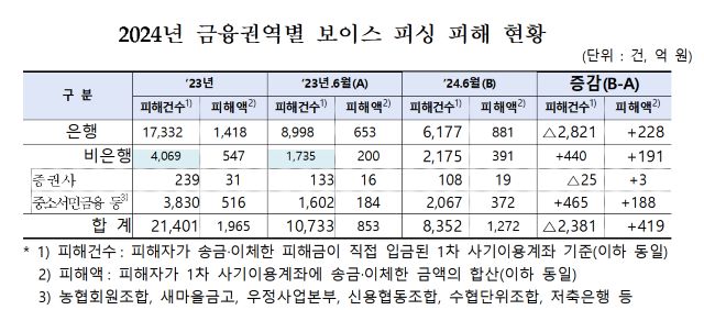17일 국회 정무위원회 소속 민병덕 의원(더불어민주당)이 금융감독원으로부터 제출받은 자료에 따르면 2023년 금감원이 파악한 ‘금융권역별 보이스 피싱 피해’는 은행과 비은행(증권사, 중소 서민금융 등)을 합쳐 총 1965억원으로 집계됐다.