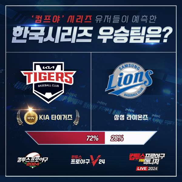 컴투스는 자사가 서비스하는 KBO 리그 공식 라이선스 기반 게임 3종인 컴투스프로야구2024(이하 컴프야2024), 컴투스프로야구V24(이하 컴프야V24), 컴투스프로야구 for 매니저 Live 2024(이하 컴프매 Live 2024) 유저들을 대상으로 2024 KBO 한국시리즈에서 어떤 팀이 우승에 오를지 관련 이벤트를 통해 예측했다.