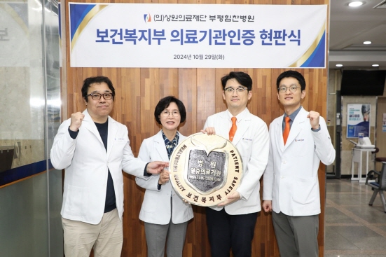 (서울=NSP통신) 박유니 기자 = 상원의료재단 부평 힘찬병원(병원장 김유근)이 보건복지부 4주기 의료기관 인증평가를 통과해 29일 인증 현판식을 개최했다. 이날 현판식에는 상원의료재단 박혜영 이사장, 김유근 병원장, 전강 원장, 신명진 원장을 비롯 병원 임직원들이 참석했다.