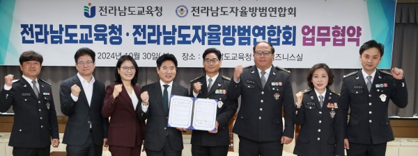 (전남=NSP통신) 김용재 기자 = 전남도교육청(교육감 김대중)과 전남도자율방범연합회(회장 조팔석)는 30일 전남도교육청에서 안전한 지역 교육환경 구축을 위한 업무협약을 체결했다.
