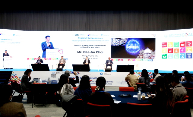 NSP통신-최대호 안양시장이 1일 오전 9시 인천 송도 컨벤시아에서 열린 제8회 유엔 아·태지역 심포지엄에서 안양시의 인공지능(AI) 기반 스마트도시 우수사례를 공유하고 있다. (사진 = 안양시)