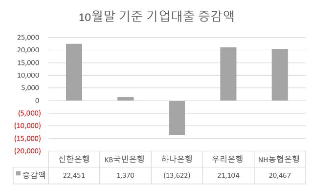 다만 이 가운데 하나은행은 5대 시중은행 중 유일하게 기업대출 잔액이 감소했다. 하나은행의 10월말 기준 기업대출 잔액은 165조 5413억원으로 전월 대비 1조 3622억원 줄었다. 금융권에 따르면 하나은행은 올 하반기 기업금융전담(RM)에 기업대출을 확대하지 말고 건전성 관리에 집중할 것을 지시한 것으로 알려졌다.