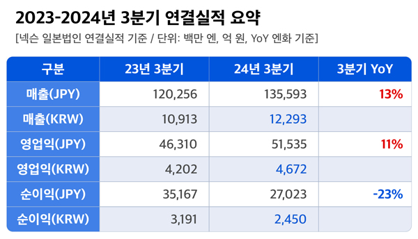 3분기 연결 기준 매출은 1356억엔(한화 1조2293억원), 영업이익은 515억엔(한화 4672억원), 순이익 270억엔(한화 2450억원)을 기록했다. 기준 환율은 100엔당 906.6원을 적용했다.(한화 100원당 11.03엔)