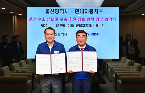 현대차는 12일 울산 북구 현대차 울산공장 홍보관에서 이동석 현대차 대표이사, 김두겸 울산시장 등 주요 관계자들이 참석한 가운데 울산시와 ‘울산 수소생태계 구축을 위한 업무협약(MOU)’을 체결했다.