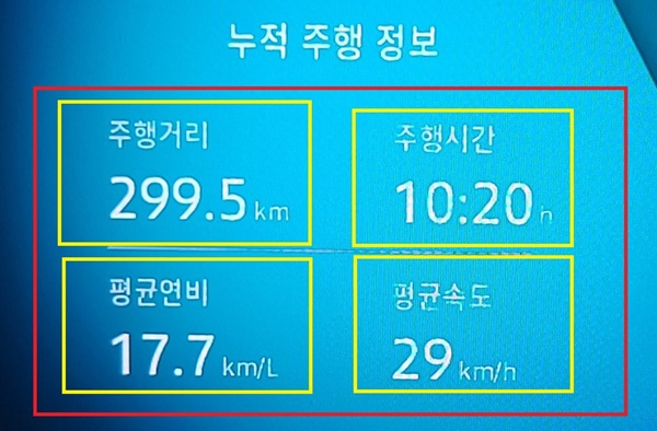 NSP통신-총 299.5km를 29km/h의 평균속도로 시승한 후 체크 한 뉴 르노 그랑 콜레오스 E-TECH 하이브리드 모델의 실제 주행 연비 17.7km/ℓ 기록 (사진 = NSP통신)