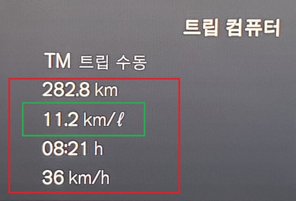 NSP통신-총 282.8km를 36km/h의 평균 속도로 8시간 21분 시승한 후 체크 한 볼보 XC90 B6 AWD 모델의 실제 주행 연비 11.2km/ℓ 기록 (사진 = NSP통신)