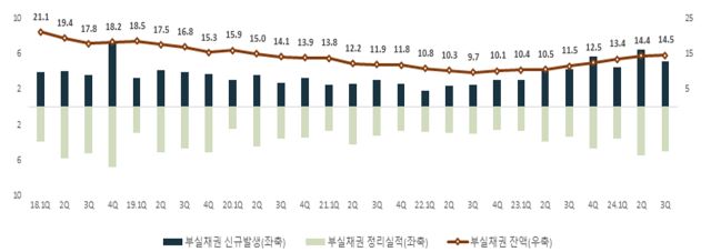 29일 금융감독원이 발표한 ‘2024년 9월말 국내은행의 부실채권 현황(잠정)’에 따르면 9월말 국내은행의 부실채권 잔액은 14조 5000억원으로 집계됐다. 이는 지난 2020년 6월말 15조원을 기록한 이후 4년만에 최고 수준을 기록한 것이다.