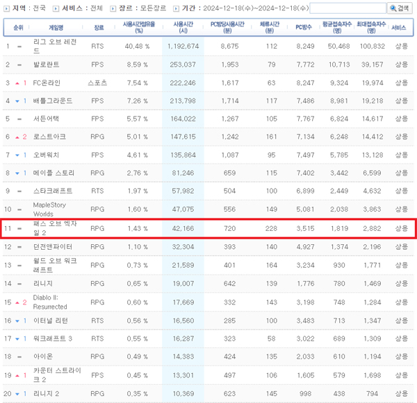 PC방 게임 전문 리서치 서비스 게임트릭스가 집계한 데이터에 따르면 패스 오브 엑자일 2는 12월 셋째 주 온라인 게임 순위 11위(12월 18일 기준)를 기록하며 출시 초기부터 많은 이용자에게 관심을 받고 있다.