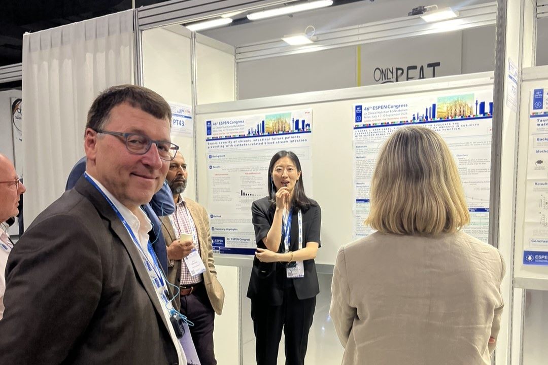 NSP통신-한미약품 GM임상팀 이문희 이사(가운데)가 9월 이탈리아 밀라노에서 열린 유럽임상영양대사학회(ESPEN)에서 단장증후군 치료제로 개발중인 소네페글루타이드의 임상 1상 약동학 결과를 발표하고 있다. (사진 = 한미약품)