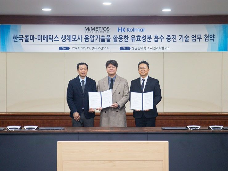 한편 협약식에는 한상근 한국콜마 기술연구원 부원장과 미메틱스 박형기 대표, 성균관대학교 방창현 교수 겸 미메틱스 CTO 등이 참석했다.