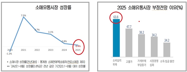 NSP통신-소매유통시장 성장률(좌)와 2025 소매유통시장 부정전망 이유(우) (사진 = 대한상의)