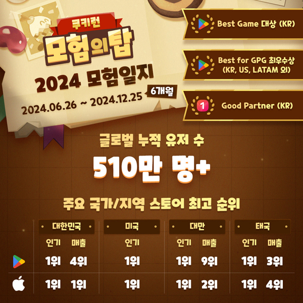 쿠키런: 모험의 탑은 작년 6월 26일 출시부터 12월 25일까지 약 6개월 동안 유저 510만명 이상이 게임을 즐겨왔다고 밝혔다.