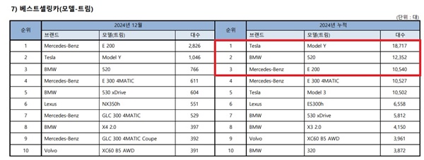 2024년 베스트셀링 모델은 테슬라 Model Y(1만 8717대), 비엠더블유 520(1만 2352대), 메르세데스 벤츠 E200(1만 540대) 순이다.