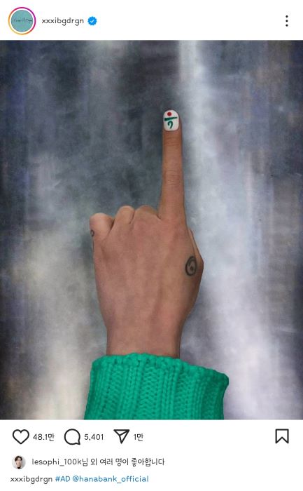 지난 11일 11시 11분, 지드래곤은 개인 SNS(소셜네트워킹서비스) 계정을 통해 숫자 ‘1’을 가리키는 손가락을 게시했다. 손톱에는 하나금융그룹의 아이콘이 그려져 있었다. ‘하나’를 의미하는 손가락 포즈로 하나금융그룹의 모델이 될 것이라는 일종의 ‘스포일러’였다.