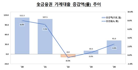 15일 금융위원회가 발표한 ‘2024년 중 가계대출 동향(잠정)’에 따르면 지난해 전 금융권 가계대출은 총 41조 6000억원(+2.6%) 증가해 전년 대비 증가폭이 확대됐다. 전금융권 가계대출 증가폭은 지난 2020년 8.0%에서 2021년 7.1%로 내려온 뒤 2022년 -0.5%로 감소 전환했다가 2023년 0.6% 증가로 전환, 2024년 2.6%를 기록했다.