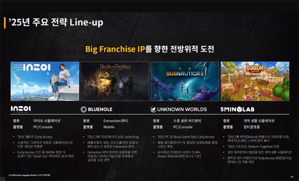 현재 크래프톤의 주요 전략 라인업으로는 ▲인조이(inZOI) ▲다크앤다커 모바일(DARK AND DARKER MOBILE) ▲서브노티카2(Subnautica2) ▲딩컴 투게더(Dinkum Together) 등이 있다.
