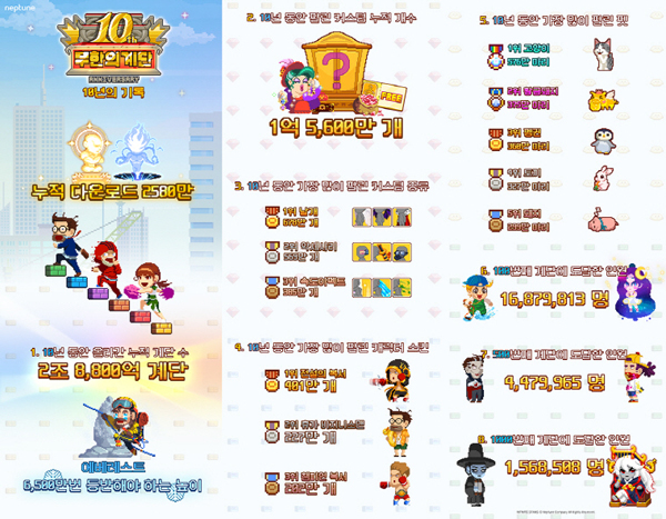 (서울=NSP통신) 이복현 기자 = 넵튠(217270)의 모바일 게임 ‘무한의 계단’이 출시 10주년을 맞아 주요 성과를 담은 인포그래픽을 13일 공개했다.