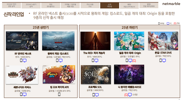 넷마블은 ▲RF 온라인 넥스트을 시작으로 ▲세븐나이츠 리버스 ▲왕좌의 게임: 킹스로드 ▲킹 오브 파이터 AFK를 2025년 상반기 출시할 계획이다. 또 연내 ▲일곱 개의 대죄: 오리진 ▲더 레드: 피의 계승자 ▲몬길: 스타 다이브 ▲프로젝트 SOL ▲나 혼자만 레벨업: ARISE 스팀 버전까지 총 9종의 게임을 출시할 예정이다.