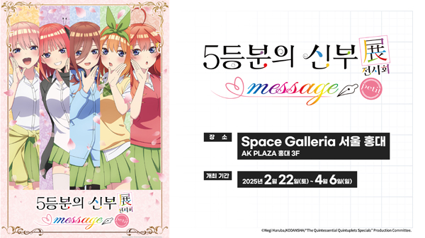 대원미디어와 무빅이 국내에서 전시하는 첫 전시로는 ‘5등분의 신부展 MESSAGE petit’이 오는 2월 22일 부터 4월 6일까지 홍대 AK플라자 ‘Space Galleria 서울 홍대’에서 개최될 예정이며 전시 진행 기간 동안에 관련 오리지널 상품 66종을 만나볼 수 있다.