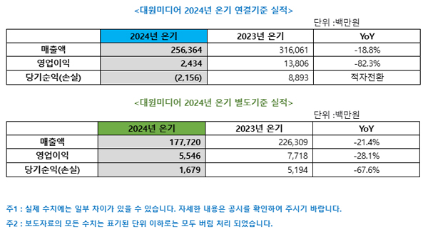 (서울=NSP통신) 이복현 기자 = 문화콘텐츠 기업인 대원미디어(048910)가 공시를 통해 2024년 온기 연결 실적을 발표했다.