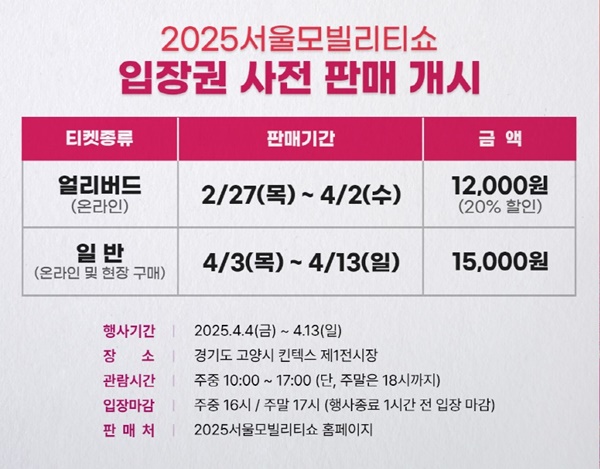 (서울=NSP통신) 강은태 기자 = 서울모빌리티쇼 조직위원회(위원장 강남훈, 이하 조직위)가 오늘부터 ‘2025서울모빌리티쇼’의 입장권 사전 판매를 시작한다. 올해 서울모빌리티쇼는 4월 4일부터 13일까지 일산 킨텍스에서 개최될 예정이다.