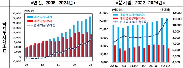 27일 한국은행이 발표한 ‘2024년 국제투자대조표(잠정)’에 따르면 지난해말 기준 순대외금융자산은 1조 1023달러(1442조 3000억 147만원)로 전년말 대비 2920억달러(421조 1516억원) 증가했다. 처음으로 1조달러를 넘어선 수준이다.