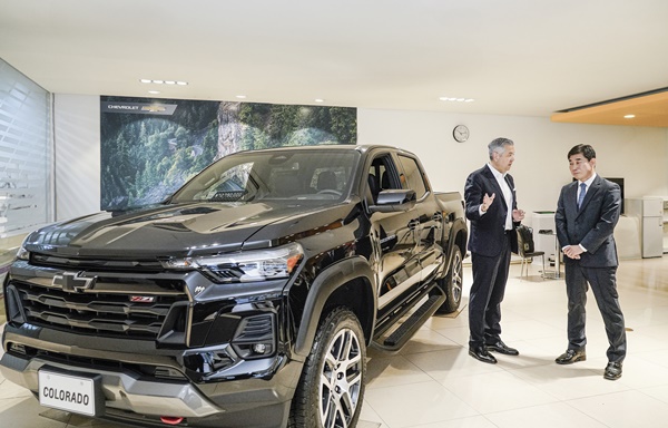 쉐보레 신촌 대리점 대표와 쉐보레 콜로라도를 둘러보며 차량에 대해 대화를 나누고 있는 헥터 비자레알(Hector Villarreal) 사장