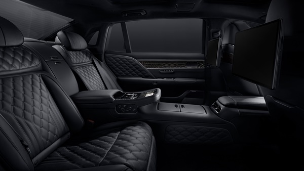 제네시스는 실내 공간에 있는 주요 버튼과 스위치, 가니쉬, 스티어링 휠 및 패들 시프트, 멀티펑션, 도어스텝 등에 모두 블랙 색상을 입혔으며, G90 롱휠베이스 블랙 전용 세미아닐린 퀼팅 시트를 적용했다.
