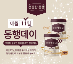 (서울=NSP통신) 박유니 기자 = 남양유업이 소비자와 함께하는 새로운 기부 캠페인 ‘동행데이’를 첫 시행한다. 이달부터 매월 11일 자사몰 ‘남양몰’에서 소비자가 ‘아이엠마더’ 분유를 구매하면, 구매 1건 당 분유 1캔을 자동 적립해 한부모가정에 기부한다.