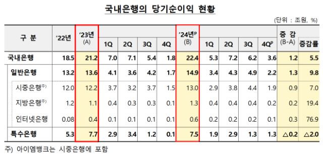 14일 금융감독원이 발표한 ‘2024년 국내은행 영업실적(잠정)’에 따르면 지난해 국내은행의 당기순이익은 22조 4000억원으로 역대 최대 기록을 경신했다.