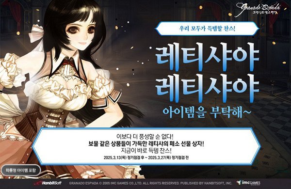 그라나도 에스파다에 따르면 3월13일 정기점검 후부터 3월27일 정기점검 전까지 ‘레티샤야 레티샤야 아이템을 부탁해’ 이벤트를 진행한다.
