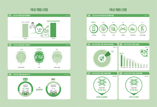 2023년 국내 게임산업 매출액은 전년 대비 3.4% 증가한 22조9642억원으로 집계되었으며, 수출액은 83억9400만 달러(한화 약 10조9785억원)로 전년 대비 6.5% 감소했다.(한국은행 2023년 연평균 매매 기준율 1307.90원 적용)
