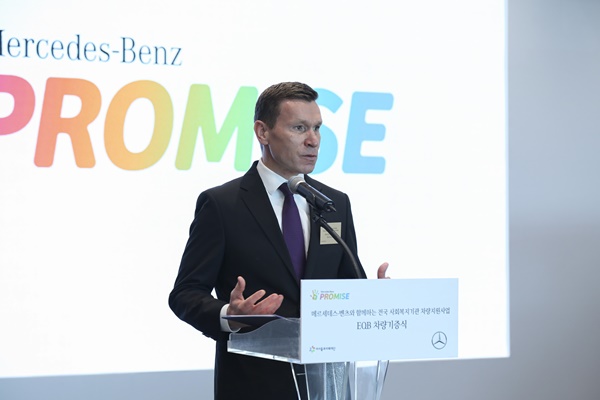 NSP통신-메르세데스-벤츠 사화공헌위원회 마티아스 바이틀 의장이 지난 17일 메르세데스-벤츠 대구 북구 서비스센터에서 진행된 전국 사회복지기관 대상 차량 기증식에서 인사말을 전하고 있다. (사진 = 메르세데스-벤츠 사화공헌위원회)