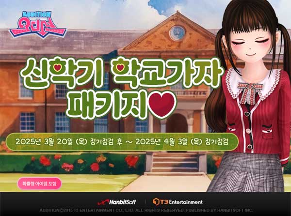 오디션에 따르면 3월20일 정기점검 후부터 4월3일 정기점검 전까지 2주간 신학기 학교가자 패키지를 기간 한정으로 특가에 선보인다.
