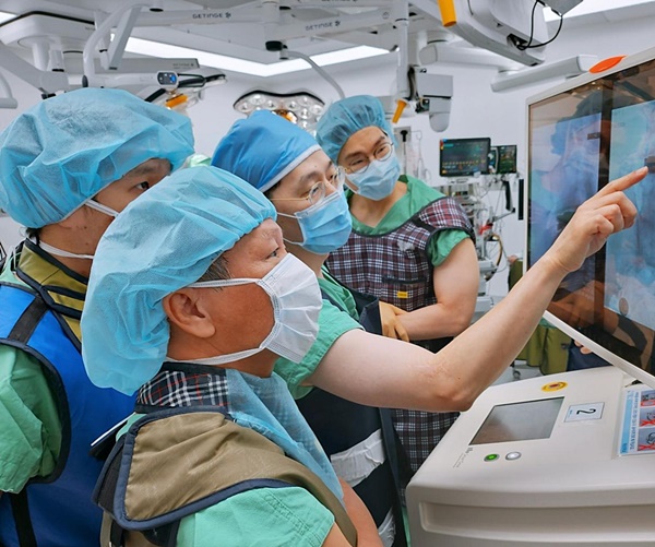 삼렬 서울대 병원 교수가 베트남 의료진에게 수술 참관 중 영상을 보며 설명하고 있는 모습 (사진 = 엘앤케이바이오)