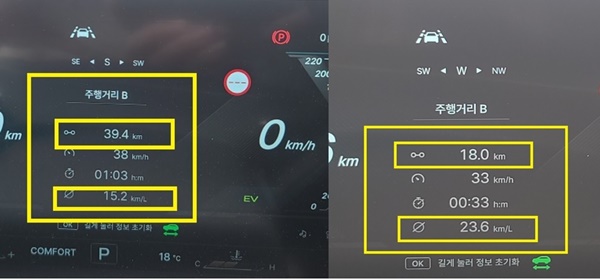 총 39.4km의 고속도로 중심의 시승 후 체크한 15.2km/L (좌)기록과 도심주행 중심의 총 18km 주행 후 체크한 23.6km/L(우) 연비 기록 (사진 = NSP통신)