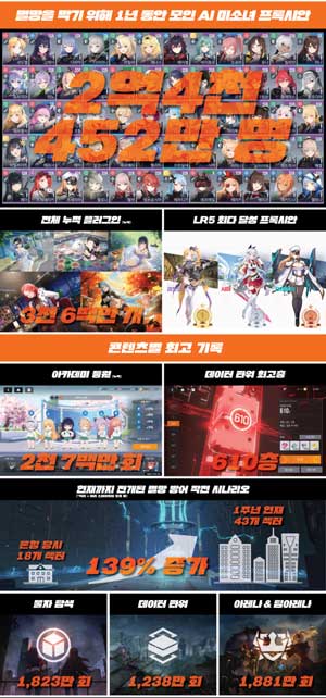 이외 캐릭터를 육성하는 아카데미는 누적 이용 횟수가 2700만회, 물자 탐색과 아레나·팀아레나는 각각 1800만회에 달하는 등 다양한 콘텐츠가 많은 사랑을 받고 있다.