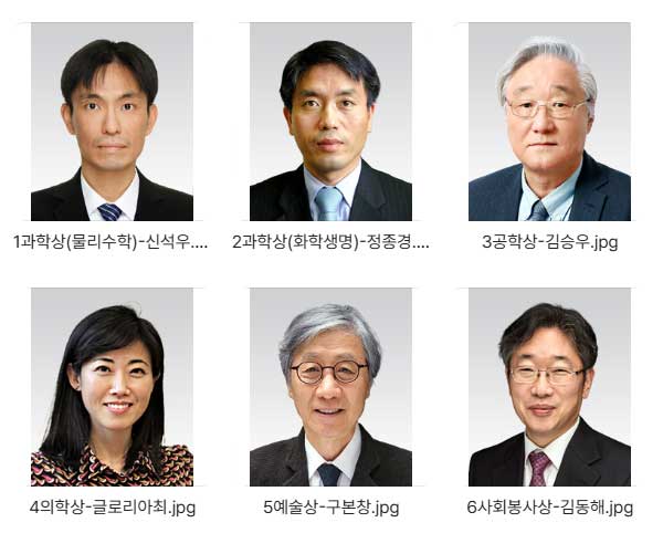 올해 수상자는 ▲과학상 물리·수학부문 신석우(47) 美 UC버클리 교수 ▲과학상 화학·생명과학부문 정종경(62) 서울대 교수 ▲공학상 김승우(69) KAIST 명예교수 ▲의학상 글로리아 최(47) 美 MIT 교수 ▲예술상 구본창(72) 사진작가 ▲사회봉사상 김동해(60)씨다.