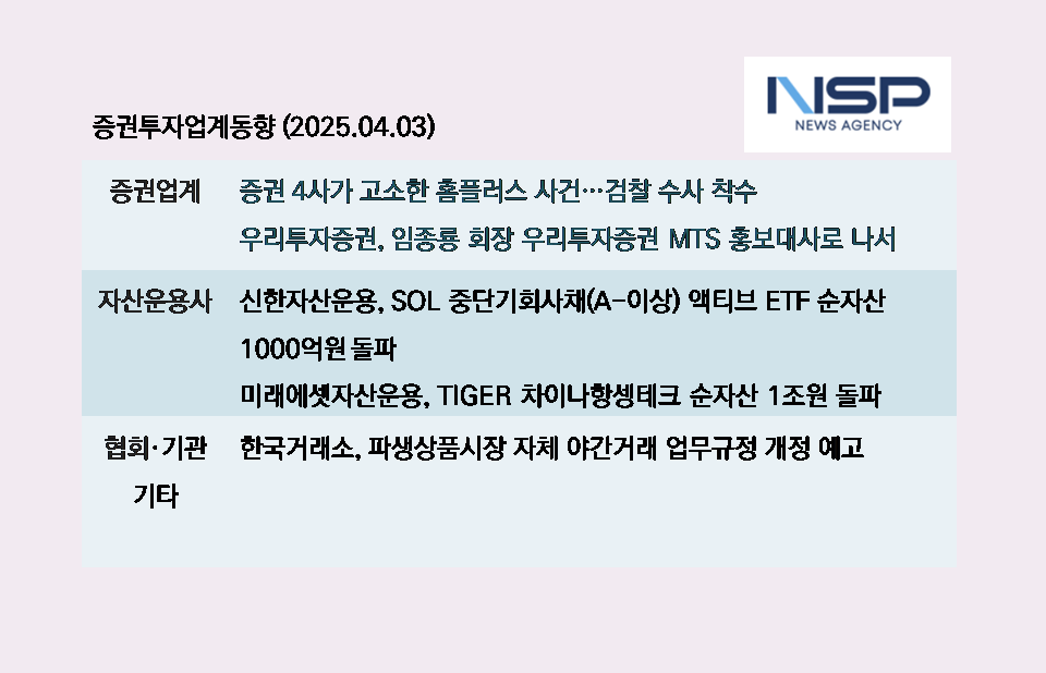 (서울=NSP통신) 설희 기자 = 지난 1일 신영증권, 하나증권, 현대차증권, 유진투자증권은 홈플러스에 대해 고소장을 접수했다. 특정 경제 범죄 가중 처벌 등에 관한 법률 위반 및 자기 자본 시장 및 금융투자업에 관한 법률 위반에 대한 검찰 수사가 착수된 상태다. 한국거래소는 파생상품시장 자체 야간거래 업무규정 개정 예고했다. 신한자산운용이 출시한 파킹형 상장지수펀드(ETF) SOL 중단기회사채(A-이상) 액티브 ETF의 순자산이 1000억원을 돌파했고 DHG자산운용은 한솔제지 거점 물류센터 PF 750억의 금융을 주선했다. 우리금융그룹의 임종룡 회장은 우리투자증권 MTS 홍보대사로 나섰다.