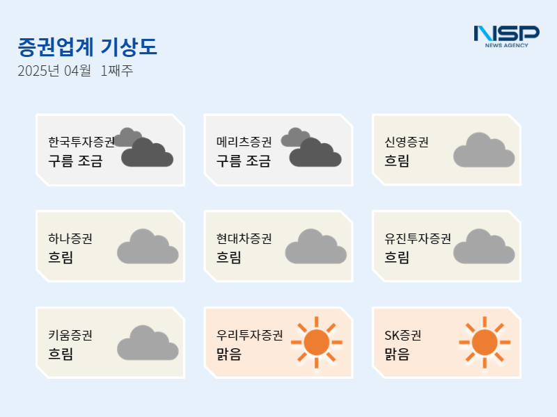 (서울=NSP통신) 설희 기자 = 2025년 3월 5주차 증권업계기상도는 우리투자증권·SK증권의 ‘맑음’, 신영증권·하나증권·현대차증권·유진투자증권·키움증권의 ‘흐림’, 한국투자증권·메리츠증권의 ‘구름 조금’으로 기록됐다.