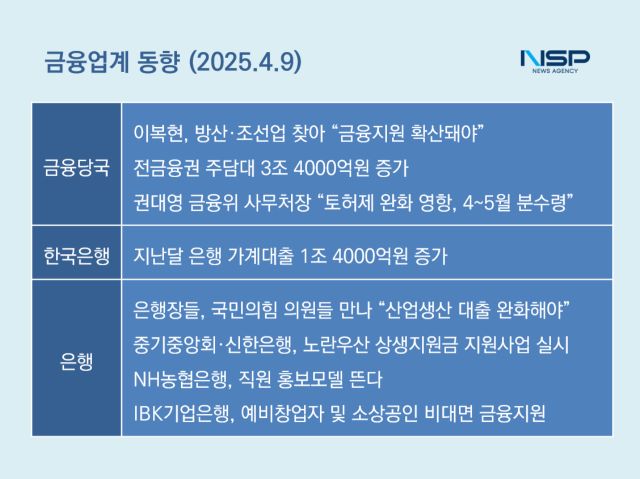 (서울=NSP통신) 강수인 기자 = 미 상호관세가 정식 발효되면서 원·달러 환율이 1480원 후반대까지 치솟고 코스피는 2300선이 붕괴됐다. 이 가운데 은행권은 국회에 환율리스크 공동대응, 사업규제 완화 등을 건의했다. 한편 토지거래허가제 완화가 가계대출의 혼란을 초래한 원인으로 지목된 가운데 오는 4월부터 본격 토허제 완화 영향이 반영될 것으로 전망된다.
